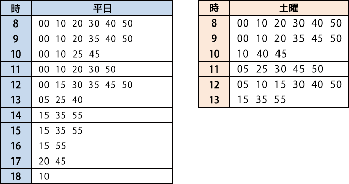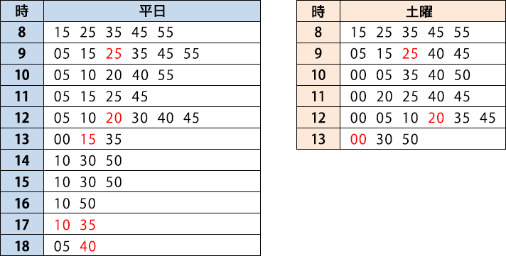 ※赤字になっている便は、「ビナレッジ」を経由するため、所要時間は約10分です。