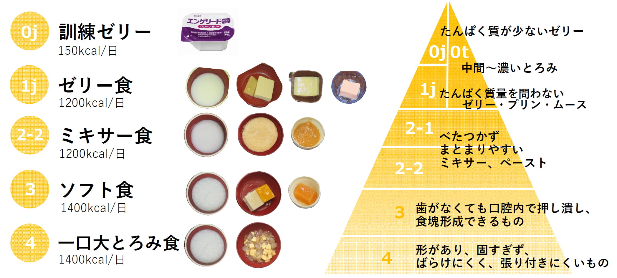 ⽇本摂⾷・嚥下リハビリテーション学会では、嚥下⾷を嚥下のレベルによって5段階に分類しています。当院の嚥下⾷はこの嚥下⾷ピラミッドに合わせた⾷事を提供しています。
