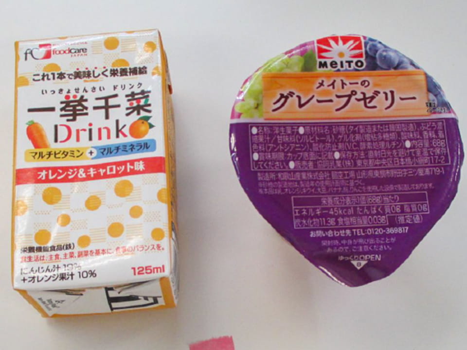 - 間食はスープやジュース、ゼリーなど飲み込みやすく、エネルギーやたんぱく質が補えるもの